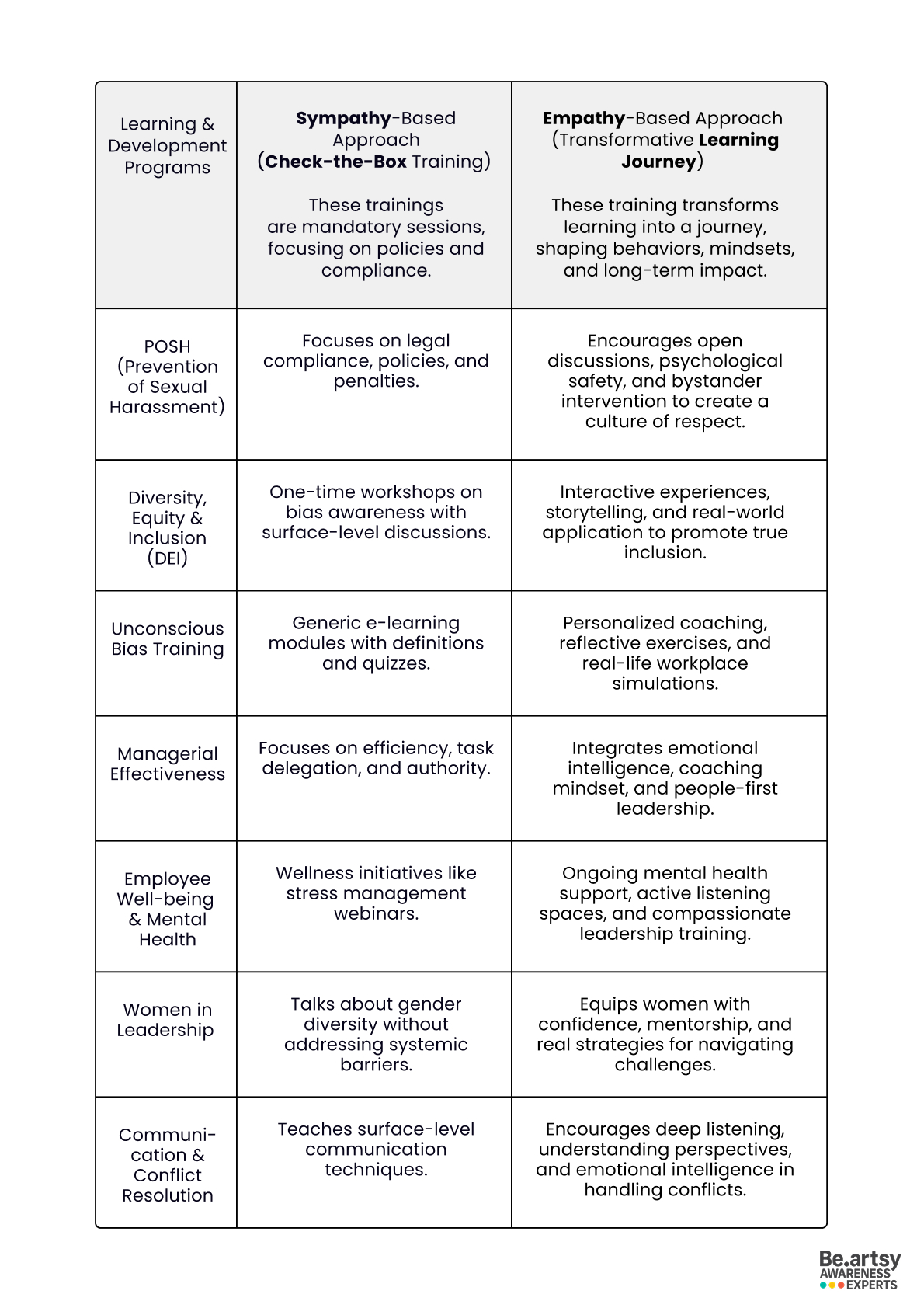 We don’t just observe—we actively engage in the learning experience to drive deep, lasting transformation. Here’s a comparative chart showing how sympathy-based and empathy-driven programs differ in action: